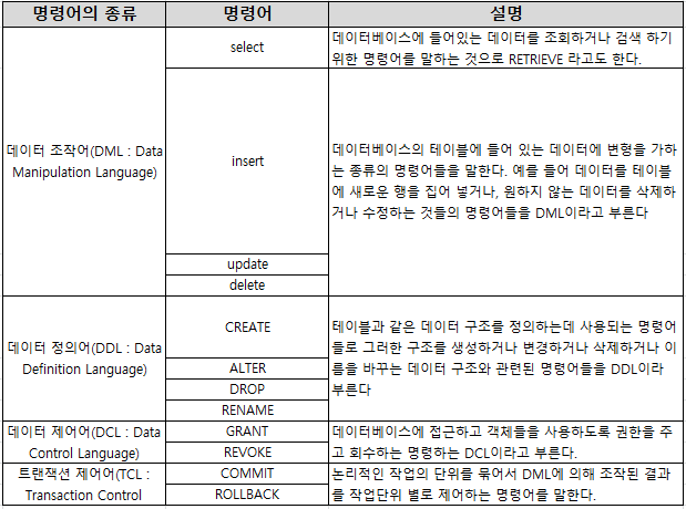 때문에, 데이터베이스를 다루고(DCL) 그 데이터베이스 내의 테이블을 다루고(DDL) 그 테이블 내의 데이터를 다루며(DML) 그 작업을 수행하는 명령어(TCL)를 다룬다.