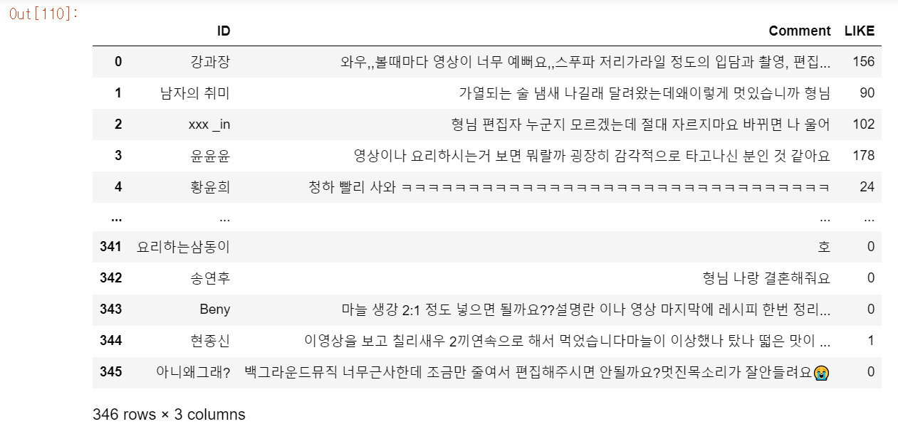 총 댓글이 678개인데 크롤링 결과는 346개 밖에 크롤링 되지 않았다...