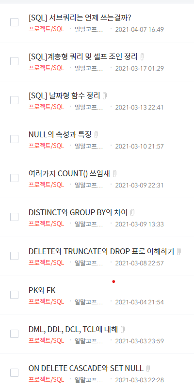 6일~10일까지는 복습하면서 개념 복습, 오답 정리, SQLD 카페 기출문제 한 번씩 훑어봤다. 마지막 5일은 공부라기보다는 그냥 확인 정도만 하고, 외워야 할 것 외웠다.