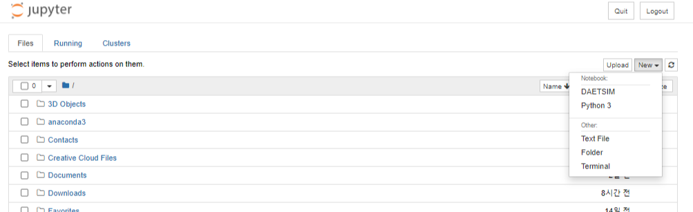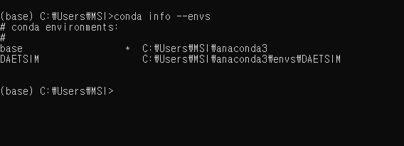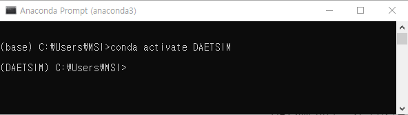 이제 가상환경을 활성화 했으니 base에서 DAETSIM으로 바뀌었다. 이제 이 위에서 jupyter notebook까지 활성화 해보자