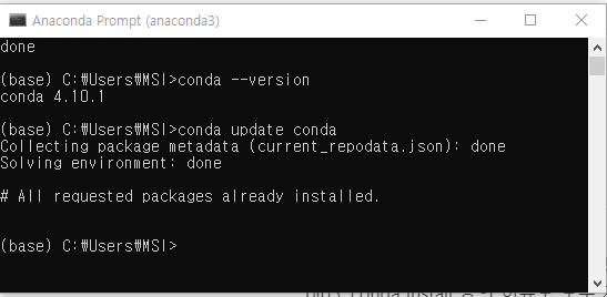 여기서 Anaconda Prompt를 실행해 아나콘다 버전을 확인하고 업데이트 한다.