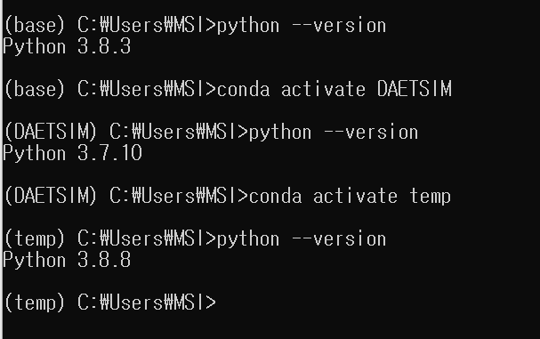 이렇게 temp라는 가상환경을 하나 더만들어 확인해본 결과는 다음과 같다. 각각의 가상환경을 활성화 할때마다 python 버전이 달라지는 것을 알 수 있다.