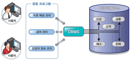위 그림을 보면 사용자가 각자의 응용프로그램을 통해 DBMS에 접근해 원하는 데이터베이스에 접근하고 작업을 진행한다. 즉, DMBS를 사용하는 것은 Client를 통해 server에 접속해 그 안에 있는 데이터베이스를 활용하는 명령을 내리는 것이다.