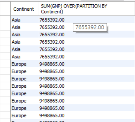 ,SUM(GNP) OVER(PARTITION BY Continent)