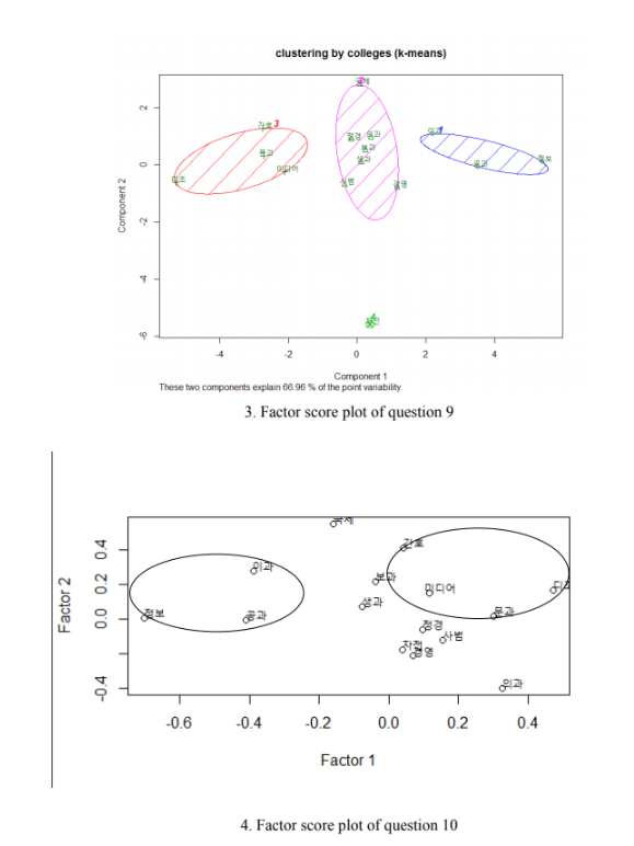 기억에 남는 건 PCA로 분석을 진행해 Dimension을 줄여 중요한 Factor를 선정하고 이를 바탕으로 단과대별 포지셔닝을 해봤는데 위 결과처럼 당시 우리가 암묵적으로 알고 있던 단과대별 이미지와 일치하게 클러스터링이 되었다. 물론.. 해석으로 밀어붙인 부분도 없잖아 있지만, 결과가 저렇게 나왔을 때 팀원들과 굉장히 신기해하고, 흥분했던 기억이 남아있다.