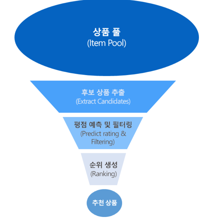 데이터베이스 내 상품의 평점, 구매, 리뷰 등을 포함한 데이터가 저장되어 있다. 유저가 추천을 요구하면 추천 로직에 의해 이 데이터들을 사용해 후보 상품을 추출하고 후보 상품의 평점 혹은 선호도를 예측한다. 이후 가장 높은 순위의 상품을 정해진 개수만큼 추천한다.